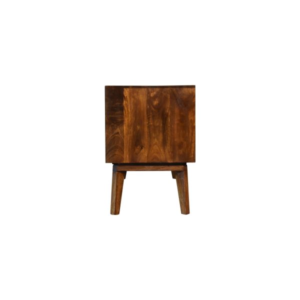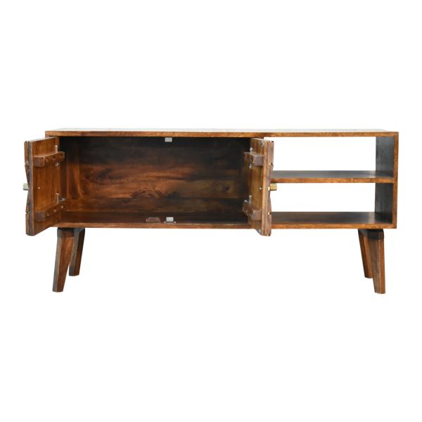 This chestnut tv unit is crafted from solid mango wood with a warm chestnut finish, offering a refined balance of style and practicality. Designed as a brass inlay tv unit, it combines open shelving with closed storage, detailed brass diamond inlay doors, and polished brass knobs, making it ideal for Scandinavian-inspired living spaces.
