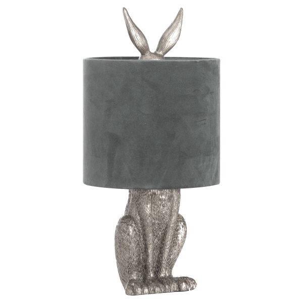 This resin animal table lamp features a sculpted hare design with a brushed nickel finish and a grey velvet shade that softly diffuses light. As a velvet shade table lamp, it adds whimsical charm and artisanal elegance to living rooms, bedrooms, or hallways.
