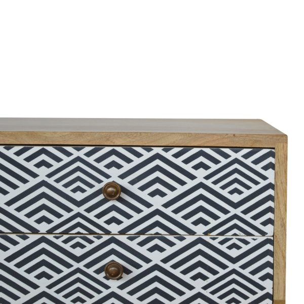 This oak toned media unit is crafted from solid mango wood with a smooth oak-like finish and a gracefully curved base. Designed as a screen printed media unit, it features monochrome drawer fronts, two drawers, two open slots, and Nordic-style legs, combining modern style with practical storage for TV and décor.