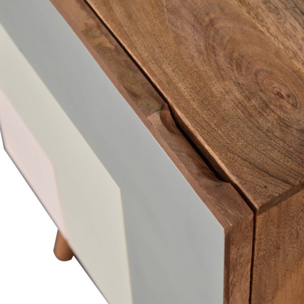 This green bedside table is crafted from solid mango wood and features a hand-painted L-shaped pattern in vibrant green hues. Designed as a patterned bedside table, it includes a single door for practical storage, Nordic-style legs, and ample top space for lamps or décor, combining style and functionality for any bedroom.