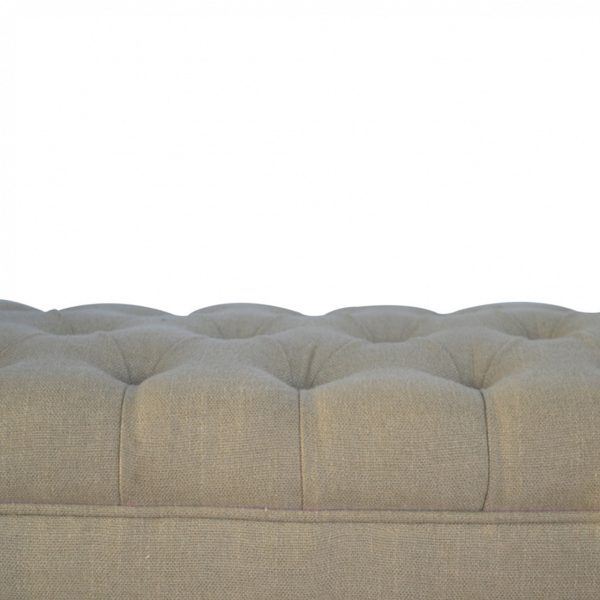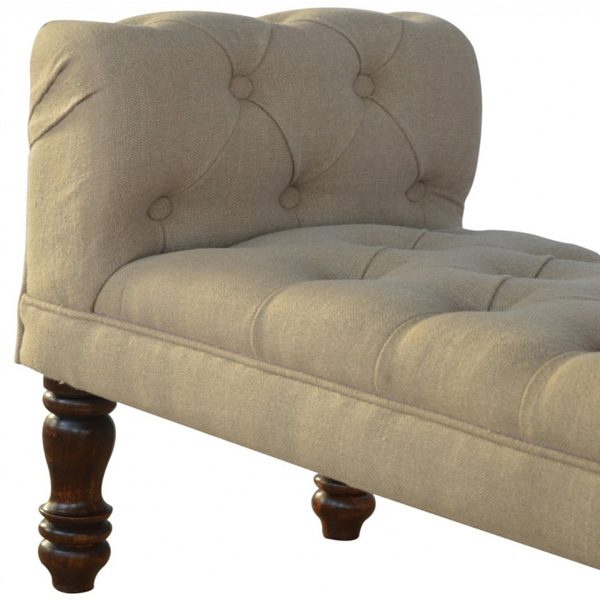 This mud linen bench features a plush deep-tufted seat with curved armrests on light walnut legs, combining style and comfort. Perfect for bedrooms or lounges, it functions as a deep buttoned bench that provides elegant seating while enhancing the cosy, refined appeal of any space.