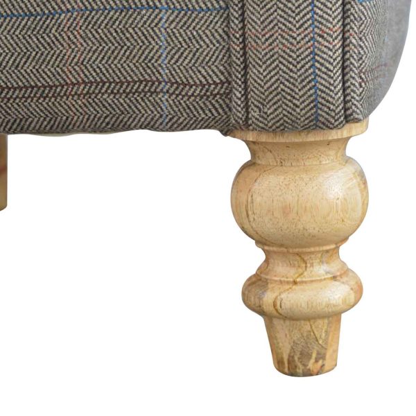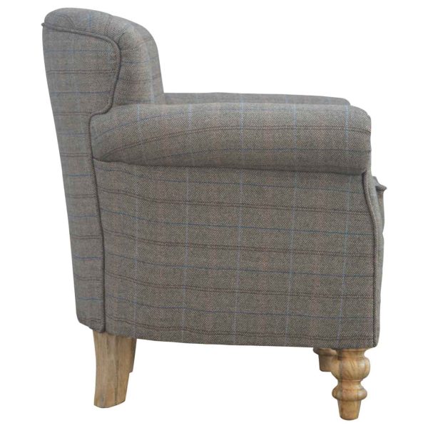 This multi tweed armchair is crafted from solid, sustainably sourced mango wood with carved detailing and a warm oak-toned finish. Designed with comfort and style, it features vibrant multi-toned tweed upholstery, sheltering arms, and a combination of hand-turned front legs with tapered rear legs, blending durability, elegance, and eco-conscious craftsmanship for any living space.