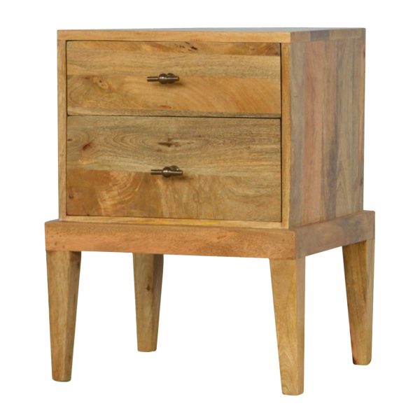 This oak toned bedside table offers a fresh and contemporary take on classic bedroom furniture. Crafted entirely from solid mango wood, it features a refined oak toned finish, a raised platform base, and four Nordic-style legs. Two practical drawers with sleek T-Bar knobs provide handy storage for bedtime essentials, making this piece a versatile and stylish addition whether used alone or paired in a bedroom setting.