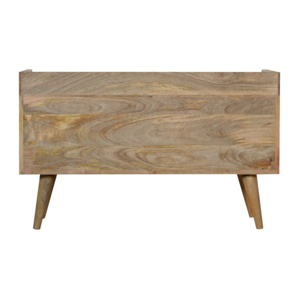 This oak toned tv unit is crafted from solid mango wood with a smooth oak-like finish. Featuring two drawers with bone inlay fronts, open slots, and a roomy top, it provides practical storage for media, books, and décor. The bone inlay tv unit design, complemented by a gold base and glossy knobs, adds elegant, functional appeal to any living space.