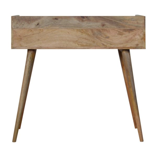 This oak toned console table is crafted from solid mango wood with a warm finish suited to entryways or lounges. It features drawers with ethically sourced bone inlay and rounded knobs, standing on Scandi-style legs, making it a practical bone inlay console table that blends style with natural charm.