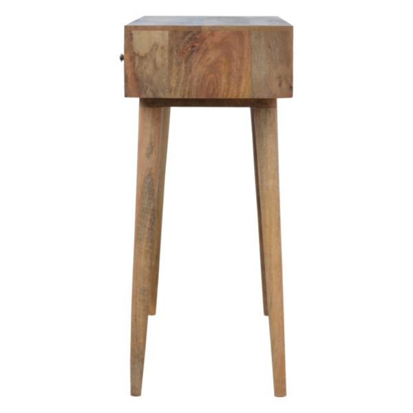 This oak toned console table is crafted from solid mango wood with a warm finish and three spacious drawers for practical storage. Glossy knobs and a wide, minimalist design create a sleek, timeless profile ideal for hallways or living spaces. Its versatile style also works as a scandi console table, combining functional organisation with elegant simplicity.