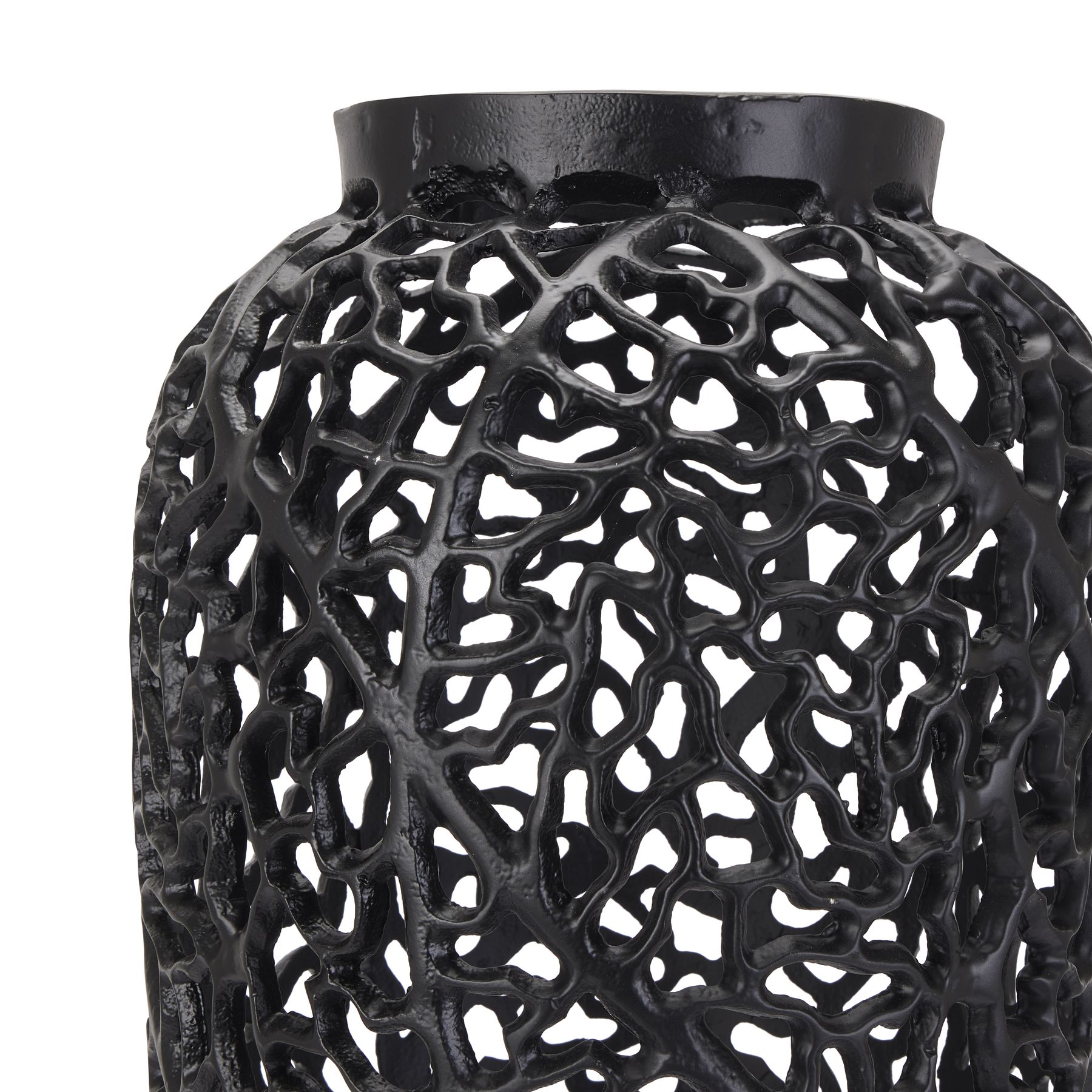 This steel floor vase features a matt black perforated lattice design, combining contemporary style with striking visual impact. Designed as a lattice design vase, it works perfectly as a floor piece or styled with twisted hazel branches, adding modern decorative appeal to any interior space.