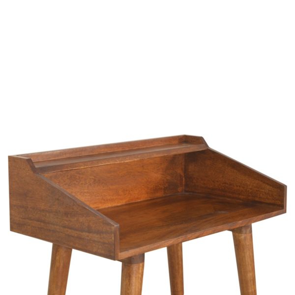 This chestnut Scandi desk features a solid mango wood frame with a chestnut finish and a single open shelf for display or storage. Designed as an open shelf desk and display table desk, it blends retro and modern charm, offering practical storage and stylish functionality to enhance any bedroom, living room, or versatile home space.
