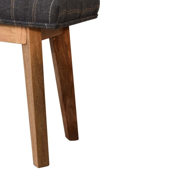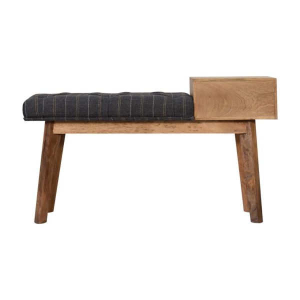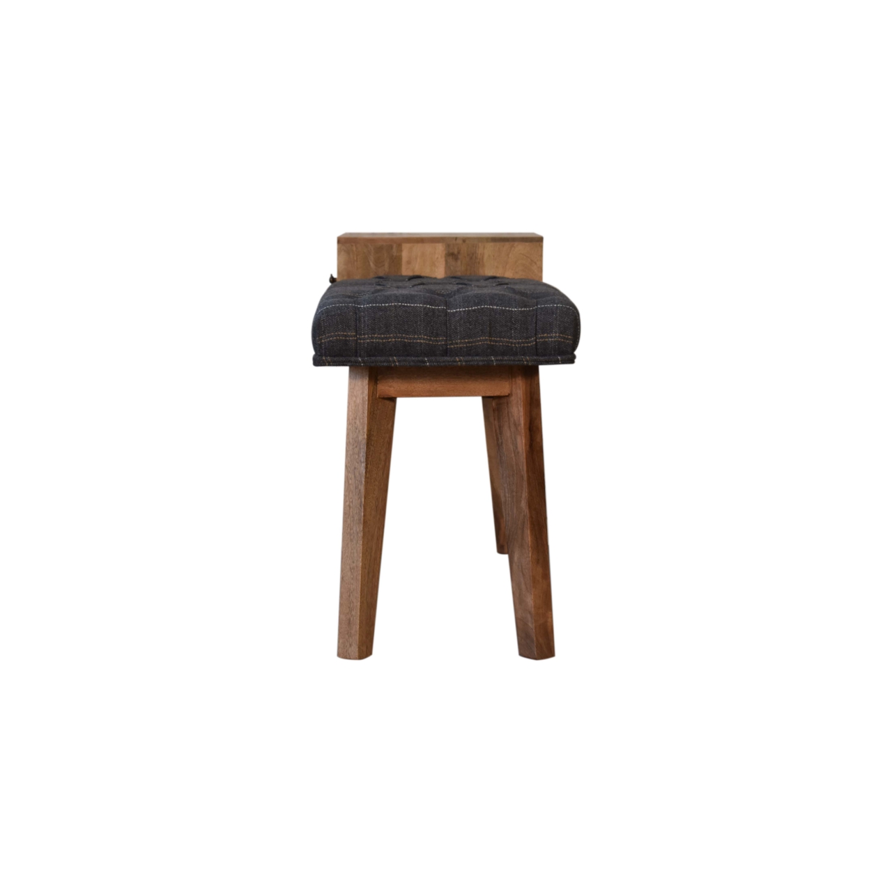This pewter tweed bench features a cushioned seat upholstered in sophisticated tweed on an oak-toned mango wood frame with a single drawer. Perfect for entryways or lounges, it provides practical storage while functioning as a Scandi storage bench that blends elegant design with versatile seating.
