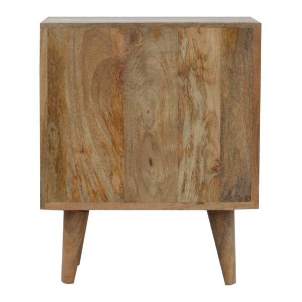This mini chest cabinet is crafted from solid mango wood with an oak-like finish, highlighting its natural grain. Designed as a Scandi mini chest, it features two drawers, two open slots, and Nordic-style legs, providing compact, practical storage with sleek Nordic-inspired style.