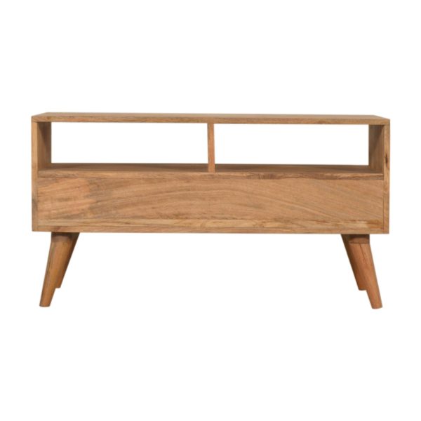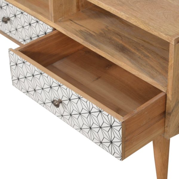 This oak toned tv unit is crafted from solid mango wood with a refined oak-like finish, combining clean lines with modern design. Designed as a geometric drawer tv unit, it features two drawers with black-and-white patterned fronts, open slots for books or media, and Nordic-style legs with polished knobs for a sleek, practical addition to any living space.