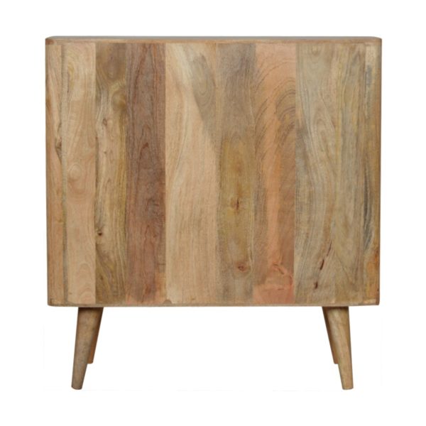 This oak toned cabinet is crafted from solid mango wood with a refined oak-like finish that highlights the natural grain. Designed as a resin embossed cabinet, it features intricately embossed leaf doors and Nordic-style legs, providing practical storage with decorative appeal for any room.