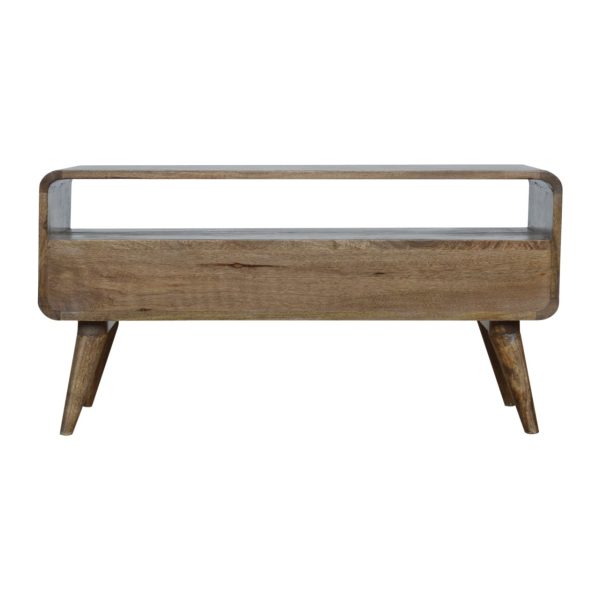 This grey wash media unit is crafted from solid mango wood with a smooth, contemporary finish. Designed as a curved media unit, it features two drawers with shiny knobs, an open slot for books or décor, and Scandinavian-style legs, combining stylish design with practical living room storage.