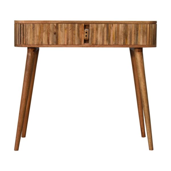 This oak toned console table is crafted from solid mango wood with a warm finish suitable for lounges or entryways. It features two drawers with cut-out handles and stands on slim Scandi-style legs, making it a practical two drawer console table that combines refined style with functional storage.