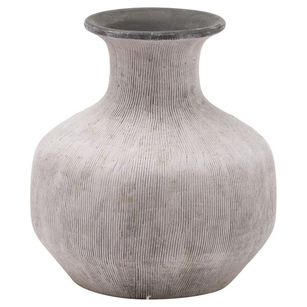 This stone-effect squat vase features a grey rim and vertical detailing that highlights its earthy texture. As a handcrafted decorative vase, it works beautifully with faux floral arrangements, adding artisanal style and presence to any interior.