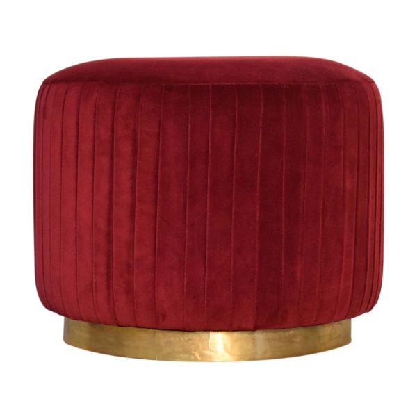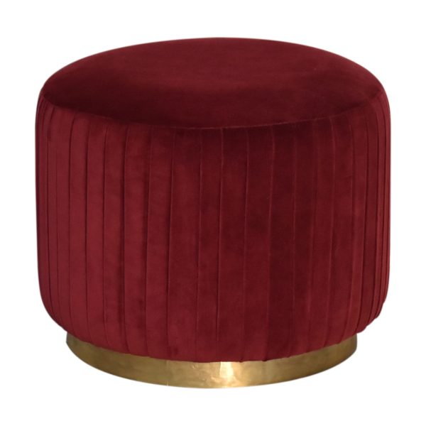 This dark red velvet footstool features a plush pleated top and a solid gold brass wood base. Fully assembled, it serves as a footstool, extra seating, or decorative accent, combining luxurious texture with sturdy construction for any bedroom, lounge, or living space.
