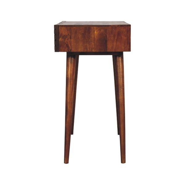 This chestnut console table is crafted from solid mango wood with a rich finish suited to modern and vintage-inspired interiors. It features two drawers with carved fronts and stands on Nordic-style legs, making it a practical carved drawer console table that combines Scandi style with versatile storage.