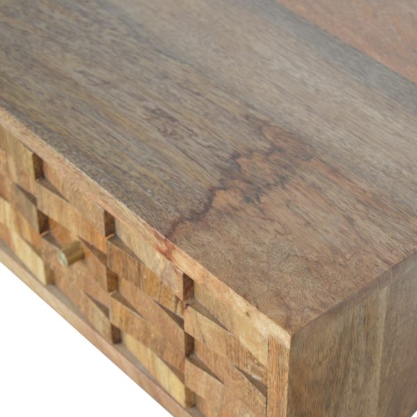 This oak toned console table is crafted from solid mango wood with a warm finish suited to modern interiors. It features two drawers with hand-carved tile fronts and candle knobs, standing on Scandi-style legs, making it a practical hand-carved drawer console table that blends modern elegance with functional storage.