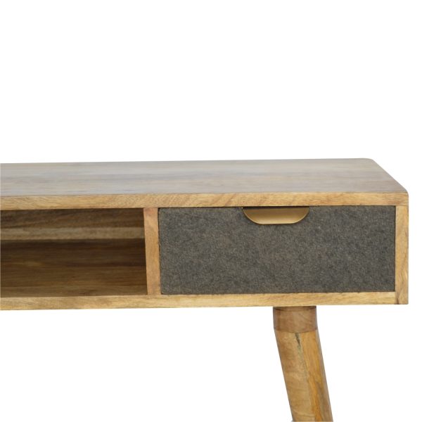 This oak toned desk is crafted from solid wood, featuring a grey tweed fabric drawer with a golden handle and an open slot for practical storage. Designed as a Scandi desk with Nordic-style legs, it combines modern style with functional workspace for studying or working at home.