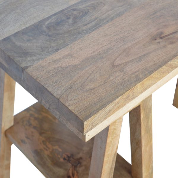 This oak display table is crafted from solid, sustainably sourced mango wood with a refined oak-toned finish for durability and timeless appeal. Designed as a Scandi style table, it serves flexibly as a dining table, writing desk, or display surface, combining practical functionality with minimalist, modern elegance for any living space.