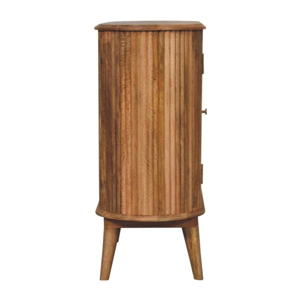 This scandi oak toned cabinet is crafted from solid mango wood with a natural oak-like finish and Nordic-style legs. Designed as a cabinet with shelves, it features brass knobs and a striped design, providing practical storage while adding a touch of contemporary charm to any living room.