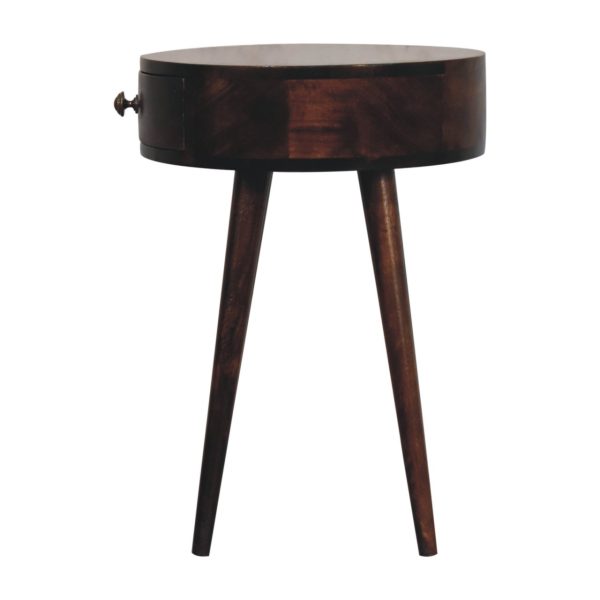 This walnut bedside table features a sleek circular design crafted from solid mango wood, providing practical drawer storage. Its minimalist Scandi bedside table style and clean round shape make it a versatile addition to modern, classic, or Scandinavian-inspired bedrooms.