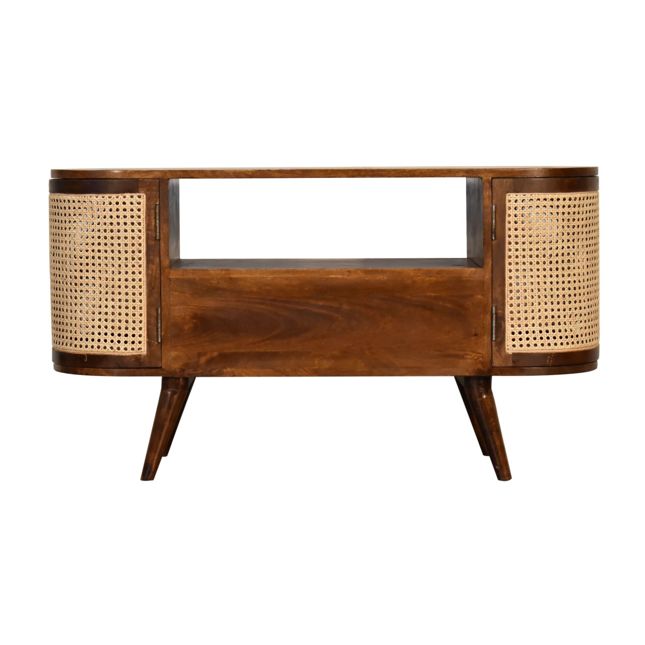 This chestnut TV unit features two woven-front cabinets and a single drawer with a brass knob, crafted from solid mango wood for lasting quality. The woven front media unit adds texture and style, while the drawer media console provides practical storage, making it a chic and versatile addition to any living room.