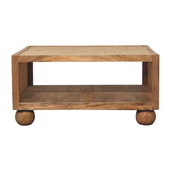 This oak toned coffee table is crafted from solid mango wood with a smooth finish and rattan accents. Designed as a large coffee table, it combines natural charm with practical use, enhancing modern, contemporary, or retro living spaces with style.