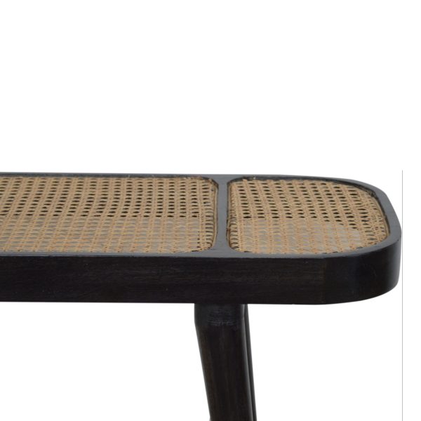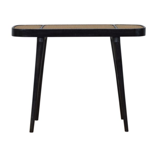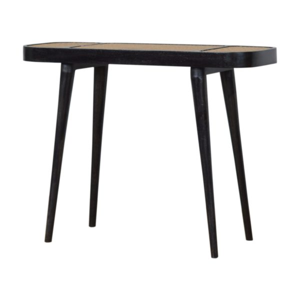 This black console table is crafted from solid mango wood with a sleek finish suited to bedrooms, entryways, or lounges. Its softly curved edges provide a gentle aesthetic, making it a practical curved edge console table ideal for versatile display and stylish storage.