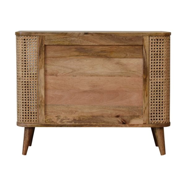 This oak toned double rattan cabinet is crafted from solid mango wood with a refined oak-style finish, offering practical storage with subtle elegance. Designed as a shelved display cabinet, it features intricate rattan detailing, four shelves, a spacious top surface, and Nordic-style legs, providing versatile and stylish storage for any room.