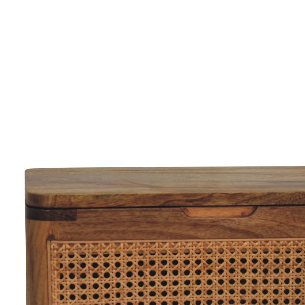 This rattan storage stool features a woven top with a lift-up lid and solid mango wood Scandi-style legs in an oak-toned finish. Fully assembled, it provides discreet storage while serving as a stylish accent, combining practical functionality with modern elegance for bedrooms, hallways, or living spaces.
