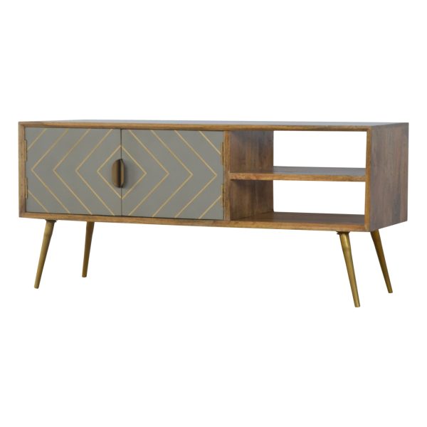 This oak toned media unit is crafted from solid mango wood with a polished oak-like finish. Designed as a brass inlay media unit, it features grey cement door fronts with gold detailing, two open slots, and Nordic-style legs, combining contemporary style with practical storage for books, décor, and essentials.