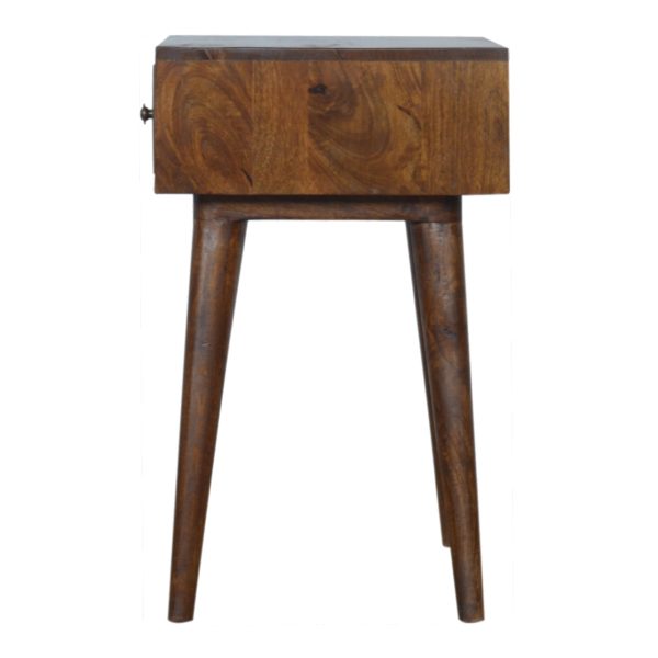This brass inlay bedside table is expertly crafted from 100% solid mango wood with a rich chestnut finish, bringing refined style to modern interiors. Designed as a geometric bedside table, it features an elegant patterned brass drawer front, a sleek shiny knob, and Scandinavian-style legs, offering practical storage with a sophisticated contemporary look.