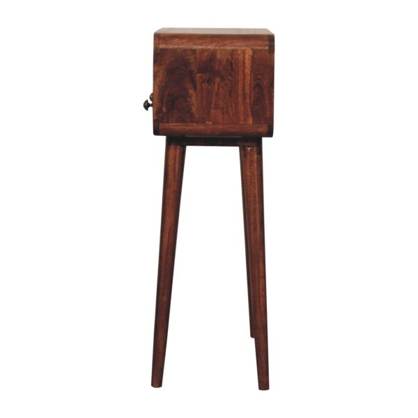 This golden oak console table is crafted from solid mango wood with a warm golden oak finish, designed to suit a wide range of interiors. Its compact country farmhouse design features smooth curved edges, two drawers with shiny knobs and an open slot for organising everyday household items. Supported by Scandinavian-style legs, this curved console table blends rustic charm with clean scandi styling, making it ideal for hallways, living areas or smaller spaces.