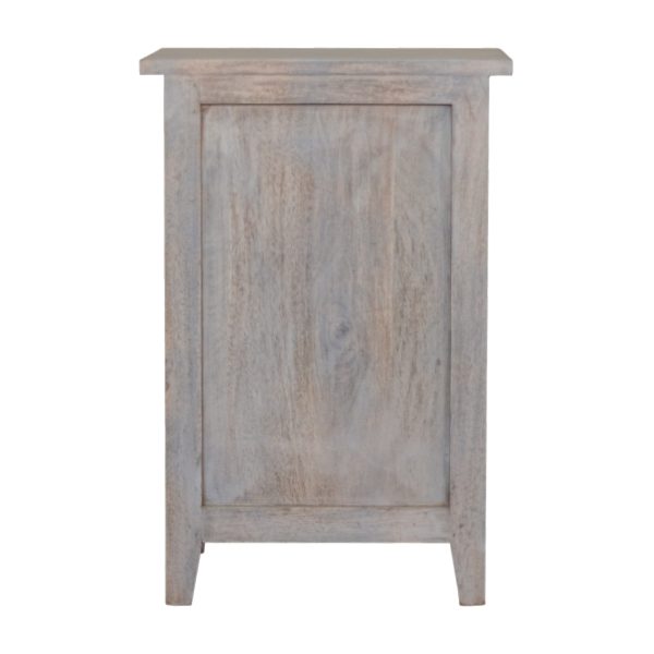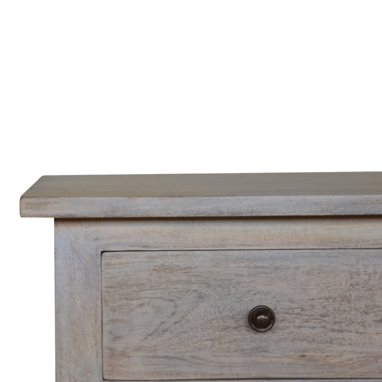 This stone bedside table is crafted from solid mango wood with a lustra acid wash finish for a sleek, modern look. Designed as an acid wash bedside table, it features tapered feet and polished brass knobs, offering practical storage while complementing contemporary bedroom decor.