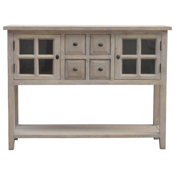 This glazed console table is crafted from solid mango wood with a weathered, acid-washed finish for a distinctive look. Designed as a weathered console table and kitchen console table, it features four drawers, two glass-front cabinets, and a lower shelf, providing practical storage with stylish, elegant appeal for any kitchen.