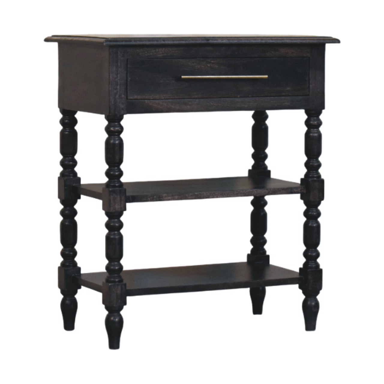 This carbon ash side table is handcrafted from solid mango wood, finished in a dramatic carbon ash tone that enhances natural texture. The side table with drawer and open shelves design provides practical storage for books, baskets, or essentials, while turned legs add heritage style. Ideal as a nightstand or hallway accent, it combines timeless detailing with durable, functional design.