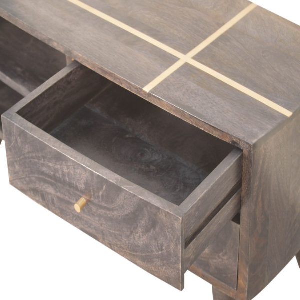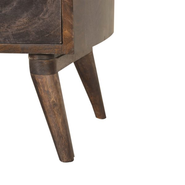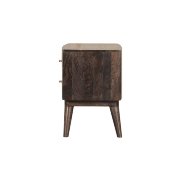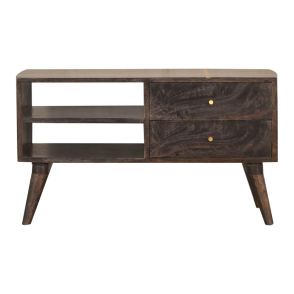 This black tv unit is crafted from solid mango wood with a smooth ash black finish, adding a sleek, contemporary touch to living spaces. Designed as a mid-century style tv unit, it features two drawers and two open slots for practical storage, making it a versatile addition to modern interiors while complementing other pieces from the Nile collection.