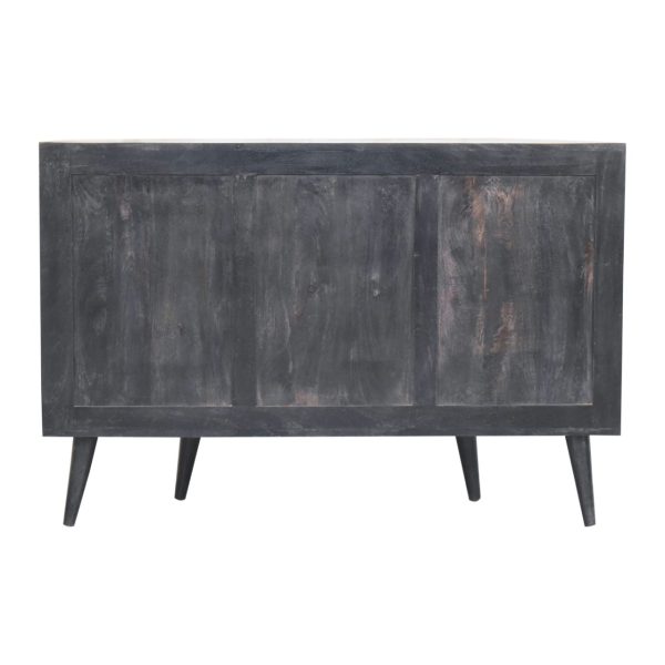 This T-bar cabinet is crafted from solid mango wood with a sleek ash-black finish, featuring gold T-bar handles and Nordic-style legs. Designed as an Art Deco cabinet with six compartments, it combines elegant design with practical storage, making it a sophisticated addition to any living room.