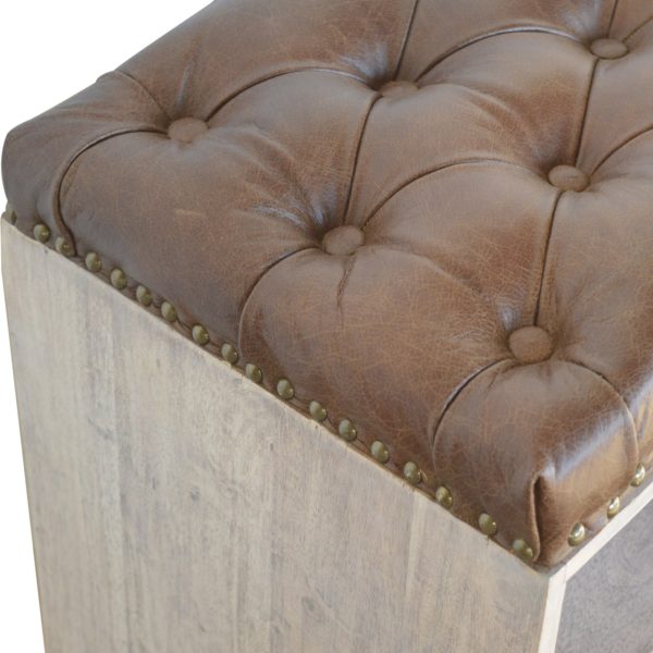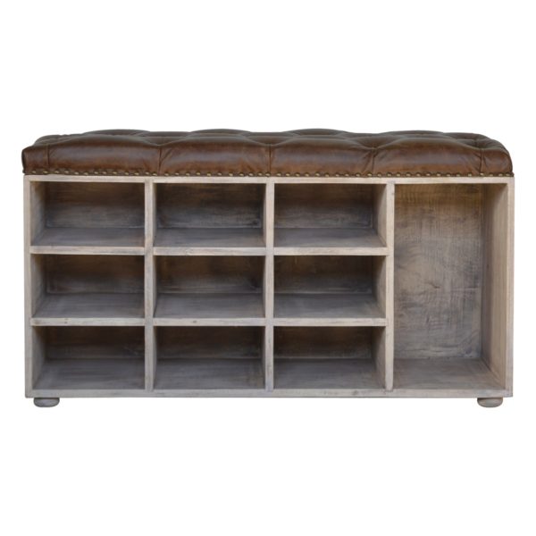 This buffalo leather entryway bench features a plush studded seat atop a solid wood frame with turned legs. Ideal for hallways, it provides practical seating and organisation with nine shoe slots and a spacious compartment, functioning as a turned leg wooden bench that combines classic style with functional entryway storage.