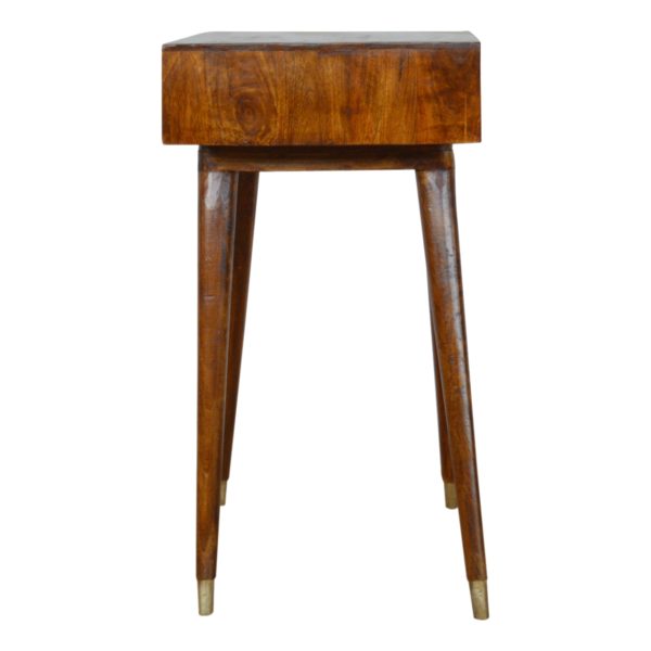 This chestnut desk is crafted from solid mango wood with a warm finish that highlights the natural grain. Designed as a scandi desk with elegant gold accents, it features a carved brass sunburst drawer, an open shelf for storage, and Scandi-style legs with gold caps, offering a stylish and functional addition to any home workspace.