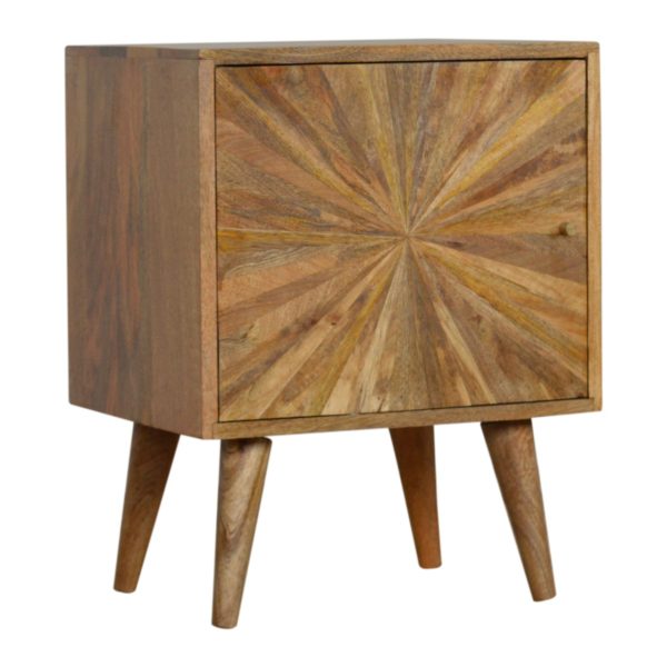 This oak toned bedside table is crafted from solid mango wood and features a striking sunburst-patterned door for a modern retro look. Designed as a sunburst bedside table, it offers practical storage while adding a timeless, stylish accent to any bedroom.