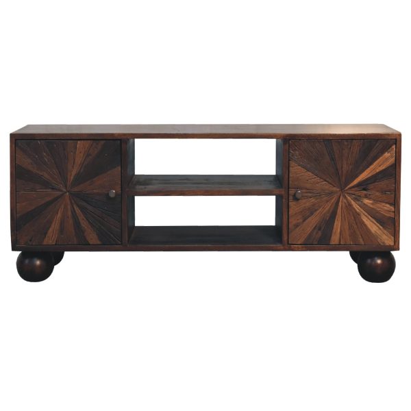 This walnut tv unit is crafted from solid mango wood with a rich finish that highlights its natural grain. Featuring shelving and cupboard compartments with brass knobs, it keeps media essentials organised. The retro tv unit design, with a sunburst pattern and ball feet, adds stylish, practical storage to any living room.
