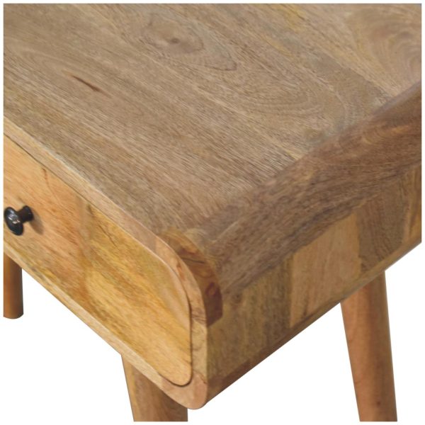 This oak toned console table is crafted from solid mango wood with a warm finish and two drawers with glossy knobs for practical storage. Rounded edges and Scandi-style legs create a sleek, elegant profile ideal for living areas. Its timeless design also works as a scandi console table, blending understated sophistication with everyday functionality.