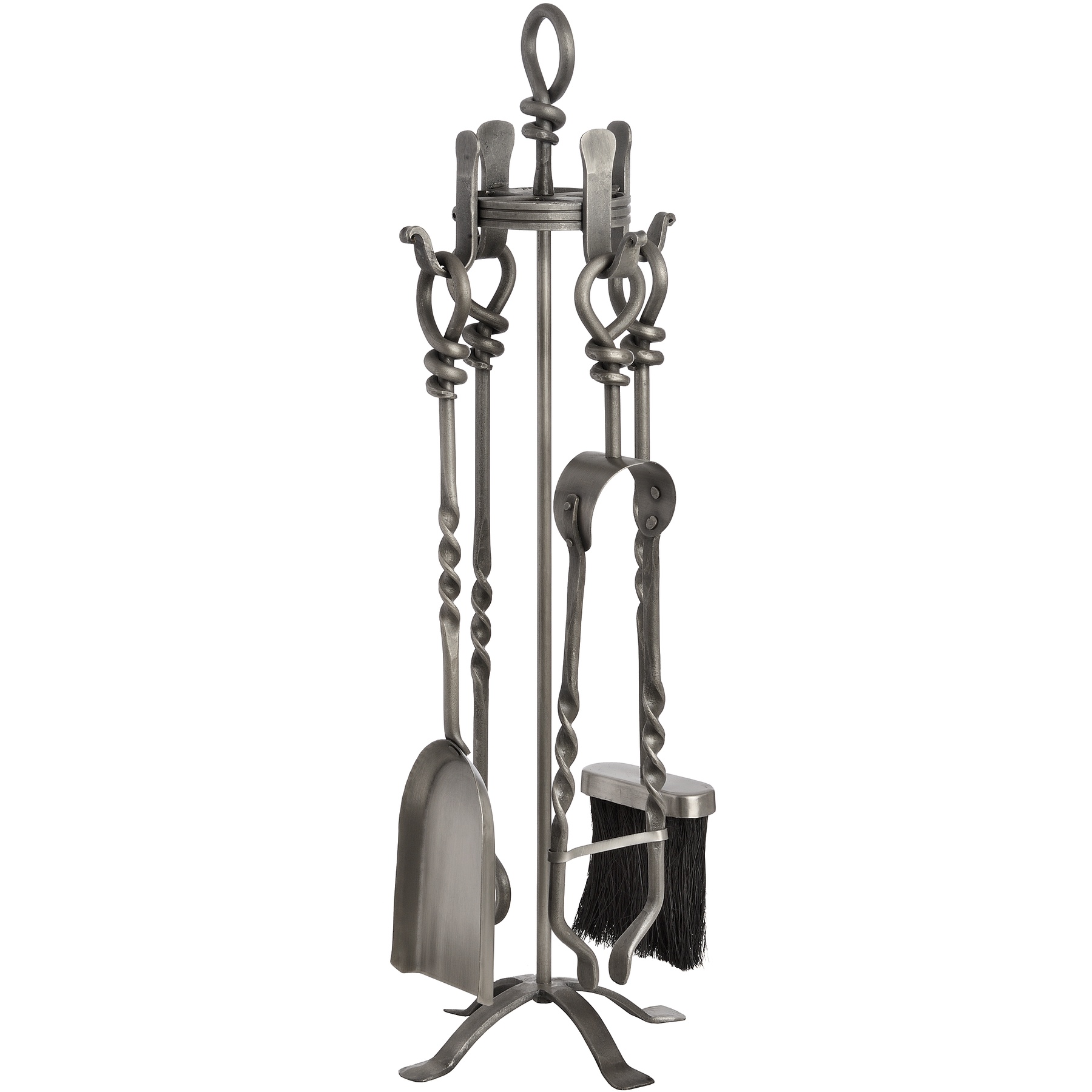 This pewter hearth tool set features a hand-turned loop-top design with a lustrous pewter finish, combining refined style and practical function. Crafted with attention to detail, these loop top fireplace tools include essential fireside tools on a sturdy stand, providing reliable use while enhancing both traditional and modern interiors with a timeless, functional design.