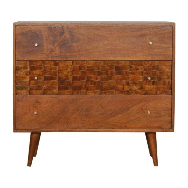 This chestnut chest of drawers is crafted from solid mango wood with a warm chestnut finish, combining contemporary style with practical storage. Featuring three spacious drawers, a carved tile front, brass knobs, and Nordic-style legs, this carved front chest also functions as a Nordic style chest, offering organised storage while adding a subtle, modern decorative touch to any room.