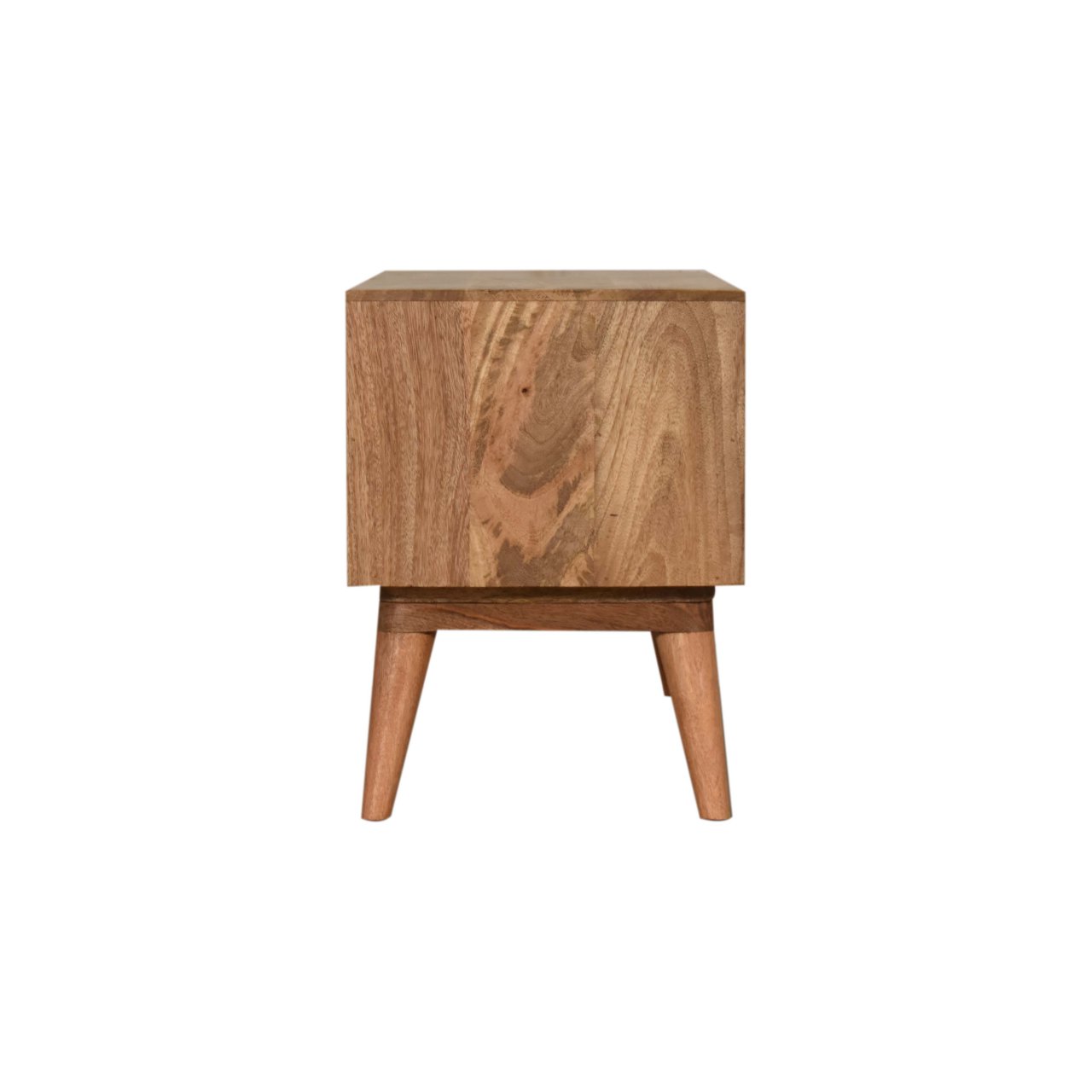 This oak toned tv unit is crafted from solid mango wood with a sleek oak-like finish, combining modern style with functional storage. Designed as a geometric drawer tv unit, it features two triangle-printed drawers, two open shelves, and Nordic-style legs, making it a stylish and practical addition to any living space.