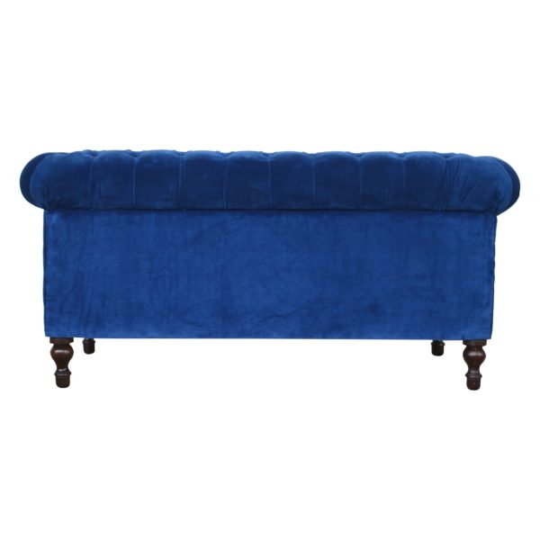 This Royal Blue Velvet Chesterfield Sofa is a striking two-seater that combines bold elegance with timeless Chesterfield charm. Upholstered in plush royal blue velvet, it features deep button tufting, refined piping, and enveloping sheltering arms for ultimate comfort. Crafted from solid, sustainably sourced mango wood and supported by four hand-turned walnut legs, this fully assembled sofa is a statement piece that enhances both modern and classic interiors with vibrant sophistication.