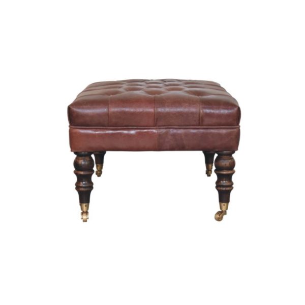 This brown leather ottoman is upholstered in luxurious buffalo hide leather, featuring a classic tufted design that adds timeless character to any interior. Supported by elegantly turned solid mango wood legs fitted with brass castor wheels, it offers both stability and easy movement. As a tufted leather ottoman, it works beautifully as seating, a footstool or an accent piece in living rooms, bedrooms or entryways.