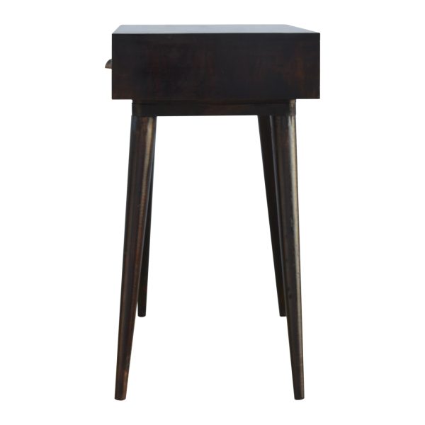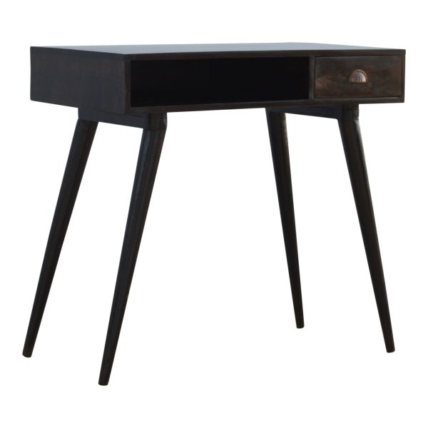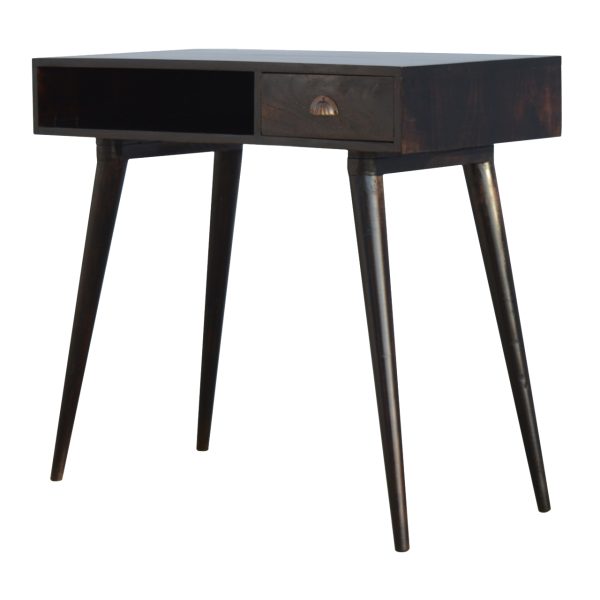 This walnut desk is crafted from solid mango wood, featuring a shell-handle drawer and an open shelf for practical storage. Supported by Nordic-style legs, it combines vintage-inspired charm with versatile functionality, making it ideal for home offices or study spaces.